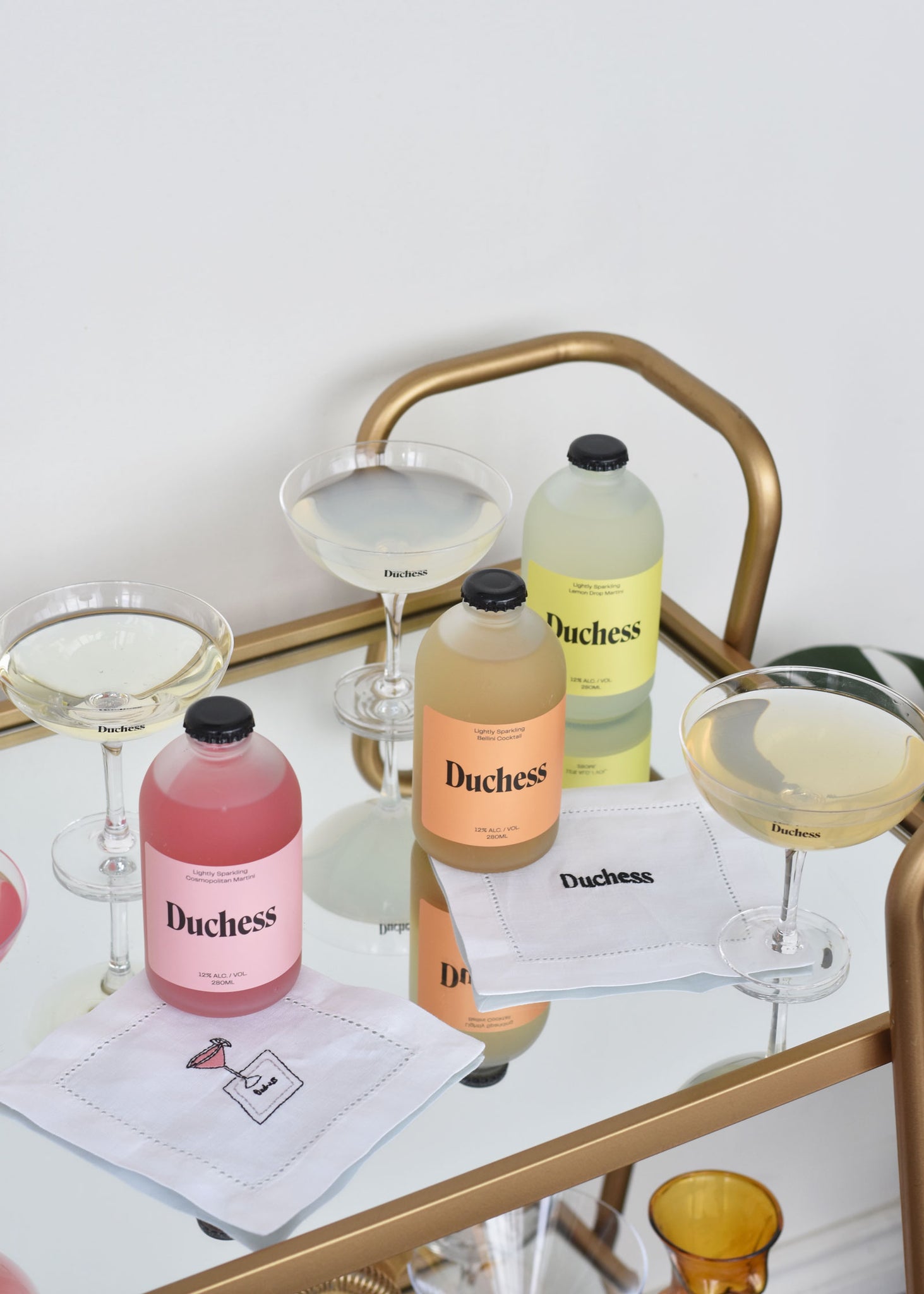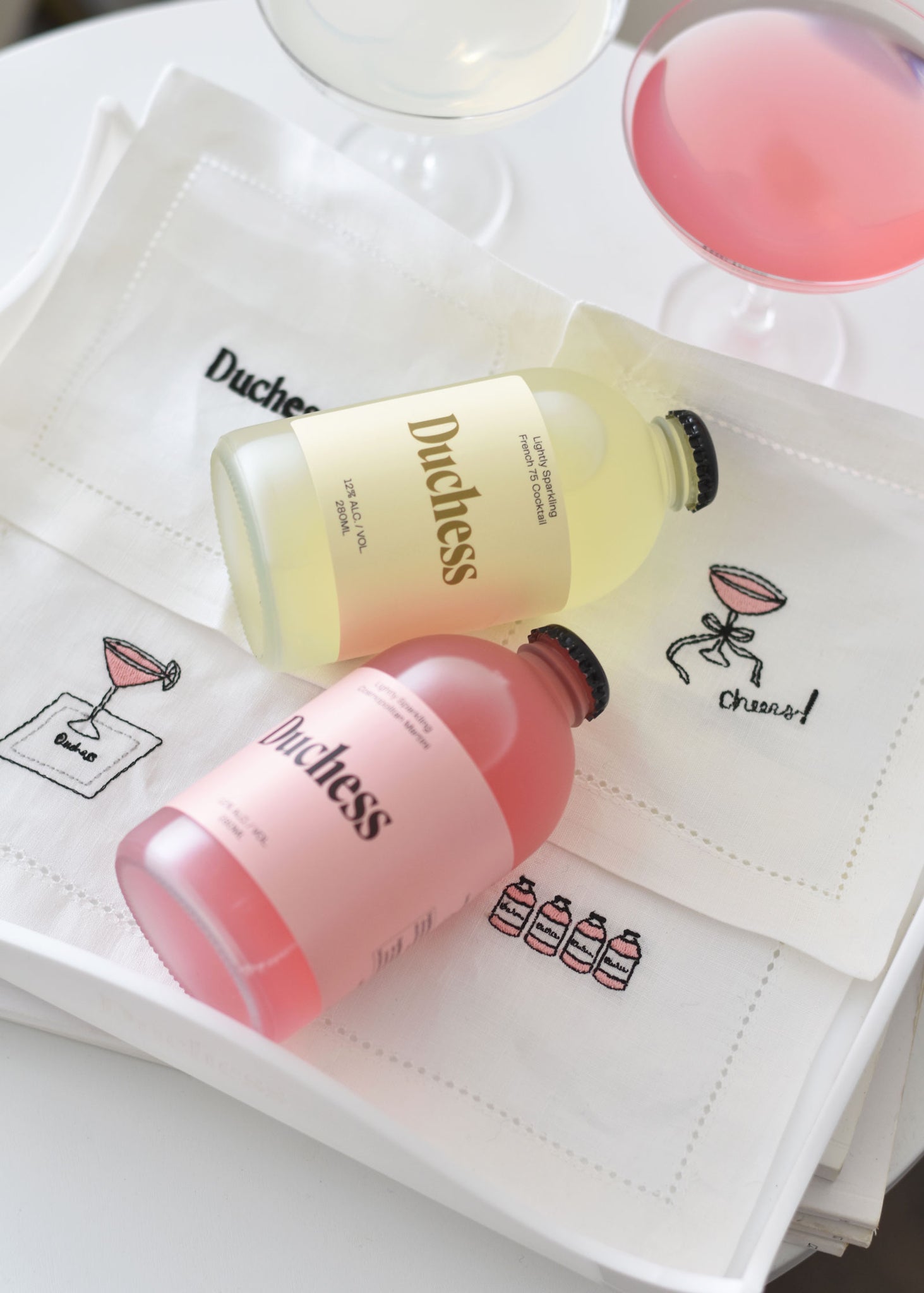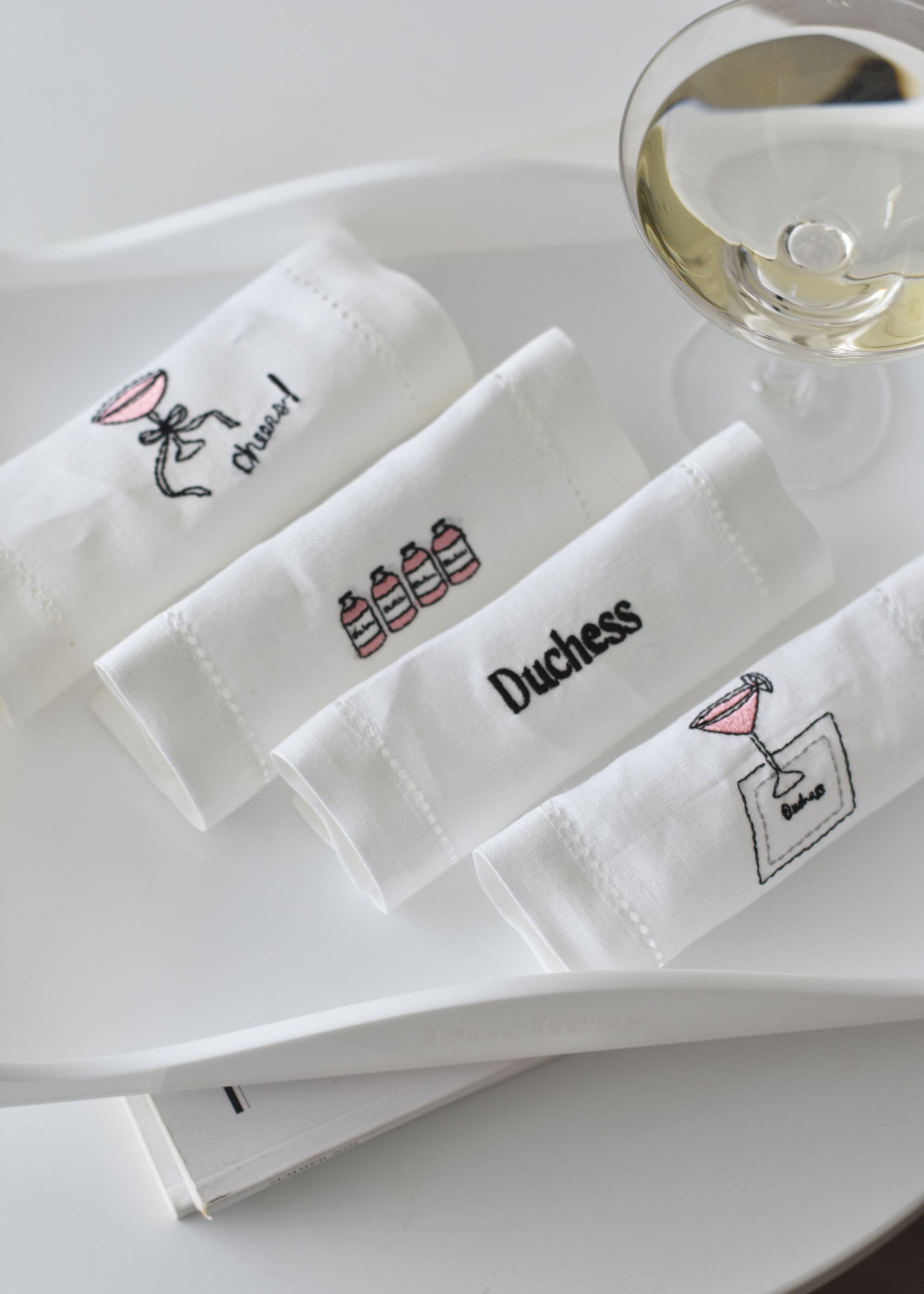 Set of 4 custom linen cocktail napkins, designed in Vancouver, BC. Each napkin features a whimsical hand drawn image that is embroidered onto soft linen. The designs are reflective of the fun and stylish cocktail culture that we love at Duchess. Use them as napkins or coasters for your beautiful glassware. Cheers!